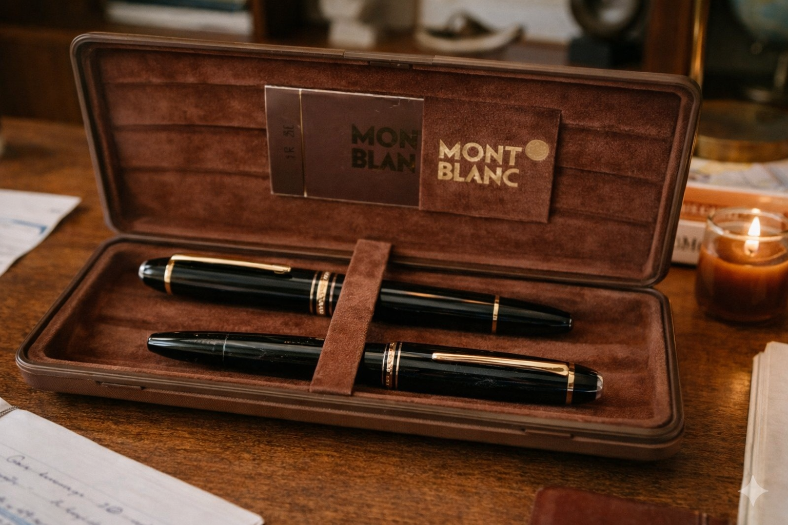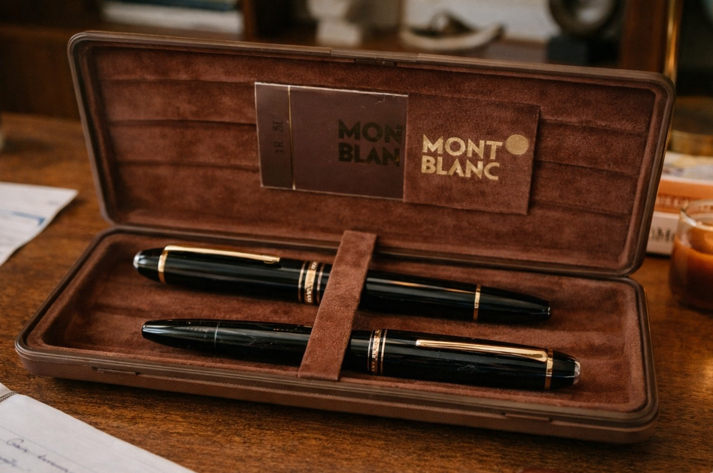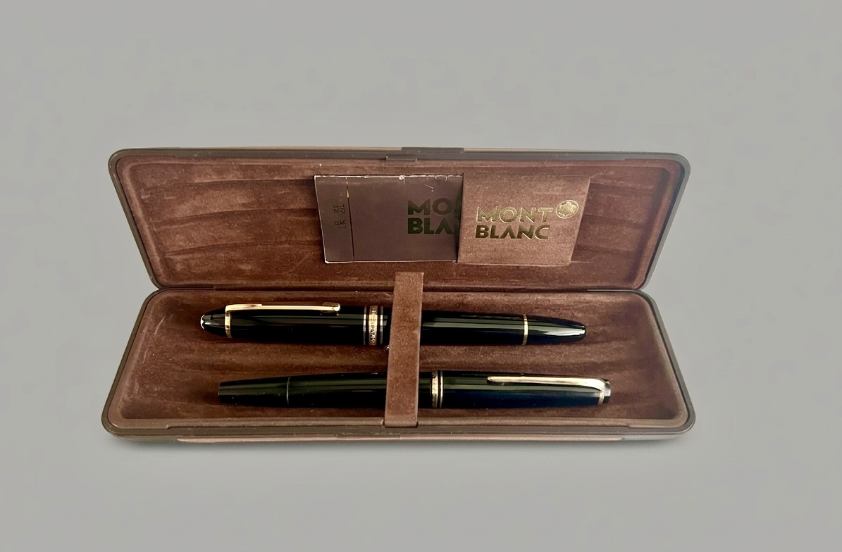 In deze set bevindt zich een 149 die — gezien de staat — ongebruikt lijkt, wat zeldzaam is. Daarnaast is er een tweede Montblanc vulpen aanwezig, waarvan het exacte type niet bekend is, maar die duidelijk gebruikt is. Juist deze combinatie maakt het interessant: een pen die zijn leven nog moet beginnen, naast een pen die al daadwerkelijk gebruikt is waarvoor hij bedoeld is — schrijven.